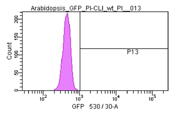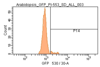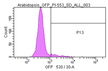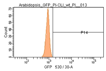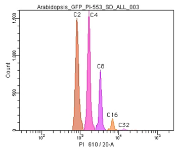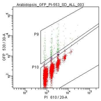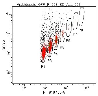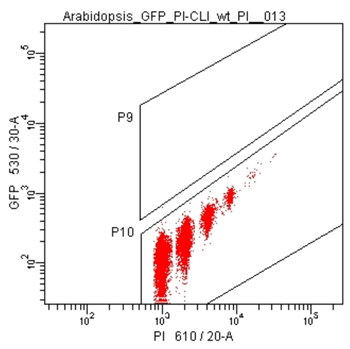|   Für die Analyse zelltyp-spezifischer Gen-Expression auf molekularer Ebene bieten sich fluoreszente Proteine an. Eines der bekanntesten ist das Grün Fluoreszierende Protein (GFP, green fluorescent protein), das ursprünglich aus der Qualle Aequorea victoria isoliert wurde. GFP eignet sich dafür besonders gut, da es als transgener Marker der Gen-Expression benutzt werden kann. Hier ein Beispiel einer zelltyp-spezifischen Analyse der Gen-Expression von Arabidopsis thaliana mittels GFP unter einem zelltyp-spezifischen Promotor in Kombination mit der Analyse des C-Wertes (DNA Gehaltes) über Propidiumjodid (PI) (Abb.1, Abb.2 u. Abb.3). Dabei können die verschiedenen zelltyp-spezifischen Expressionsmuster mit den dazugehörenden C-Werten korreliert dargestellt werden, wie z.B. der zelltyp-spezifische Arrest in den verschiedenen C-Wert Stadien. Die so gefundenen und definierten Zellkern-Populationen verschiedener Zelltypen können nun für weiterführende Untersuchungen sortiert werden.